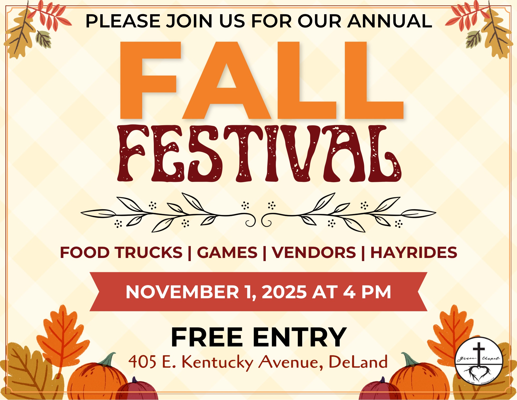 Nov 1 4:00 pm - 8:00 pm Fall Festival Grace Chapel Grace Chapel DeLand 405 E Kentucky Ave., DeLand Event Details Get Directions