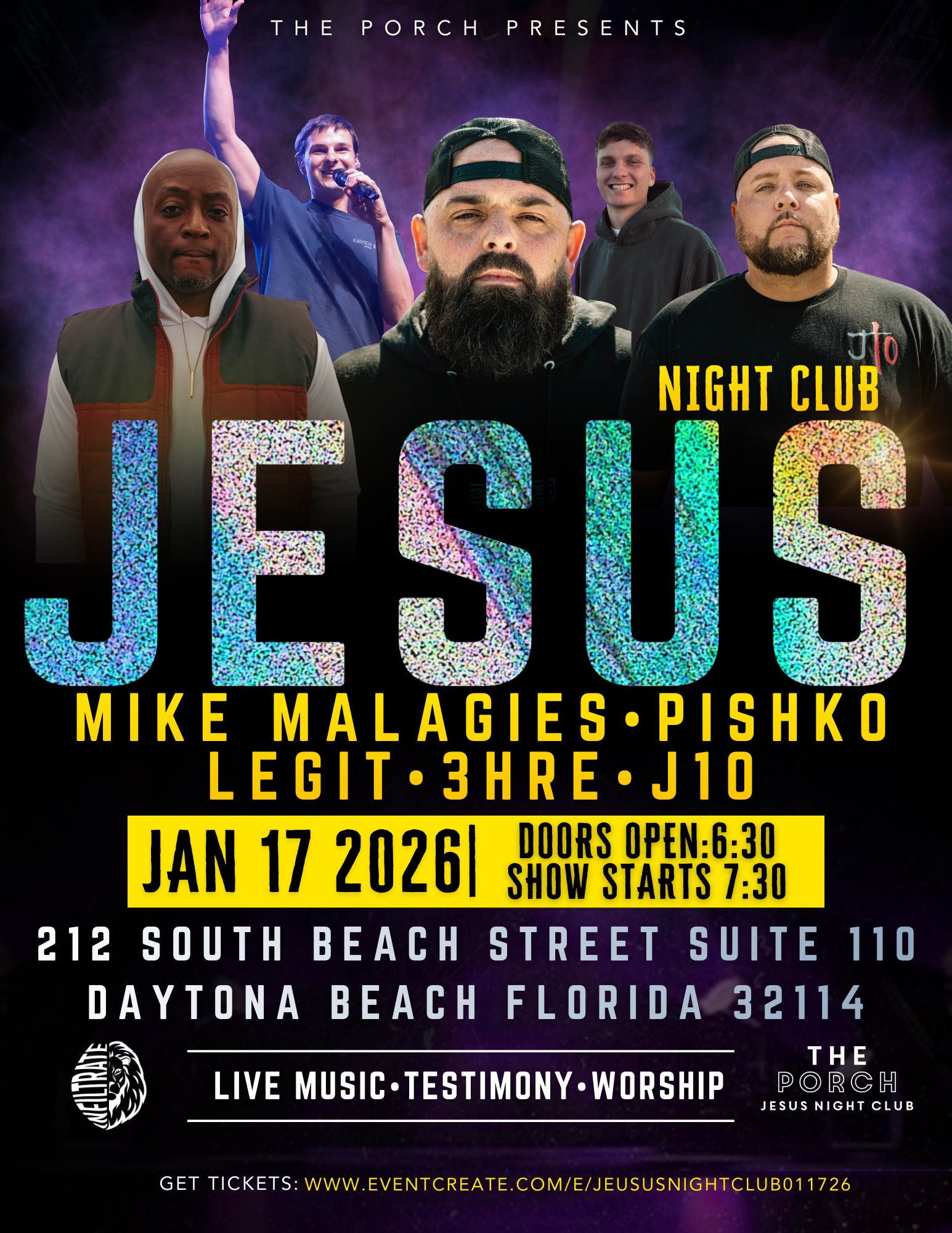 Jan 7 7:00 pm - 11:00 pm Jesus Night Club at the Porch The Porch Health Bar 212 South Beach Street, Daytona Beach Event Details Get Directions
