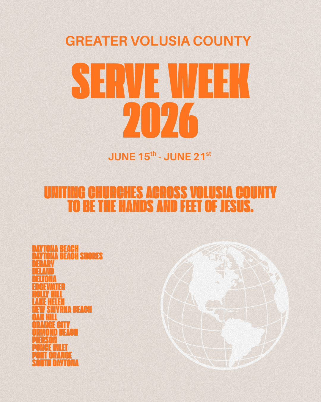 SERVE Week is a countywide week of service where faith communities unite to love our neighbors in tangible, visible ways. Churches, microchurches, ministries, and followers of Jesus across Volusia County will join together to serve neighborhoods, individuals, schools, nonprofits, and city initiatives—demonstrating the hope and love of Christ in action.